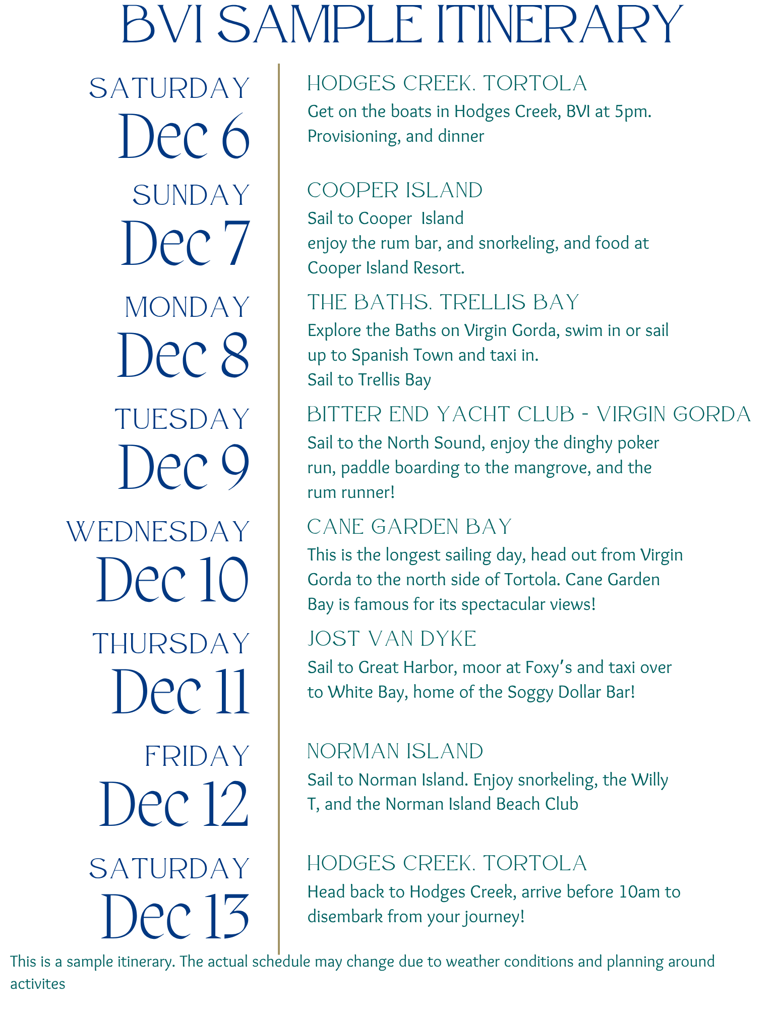 Spend eight days and seven nights exploring turquoise waters, sunny skies, and stunning destinations. We will set sail from Hodges Creek, Tortola, and circle the island with stops at Norman Island, Cooper Island, Virgin Gorda, and Jost Van Dyke. Each day offers the chance to learn new sailing skills, snorkel, and see the amazing Islands. The British Virgin Islands is made up of more than 60 stunning islands and islets at the northern end of the Lesser Antilles in the Caribbean. With beautiful islands, a lively party atmosphere and genuine Caribbean welcome from locals, these islands are popular for good reason. Enjoy easy sailing with perfect weather in the BVI!