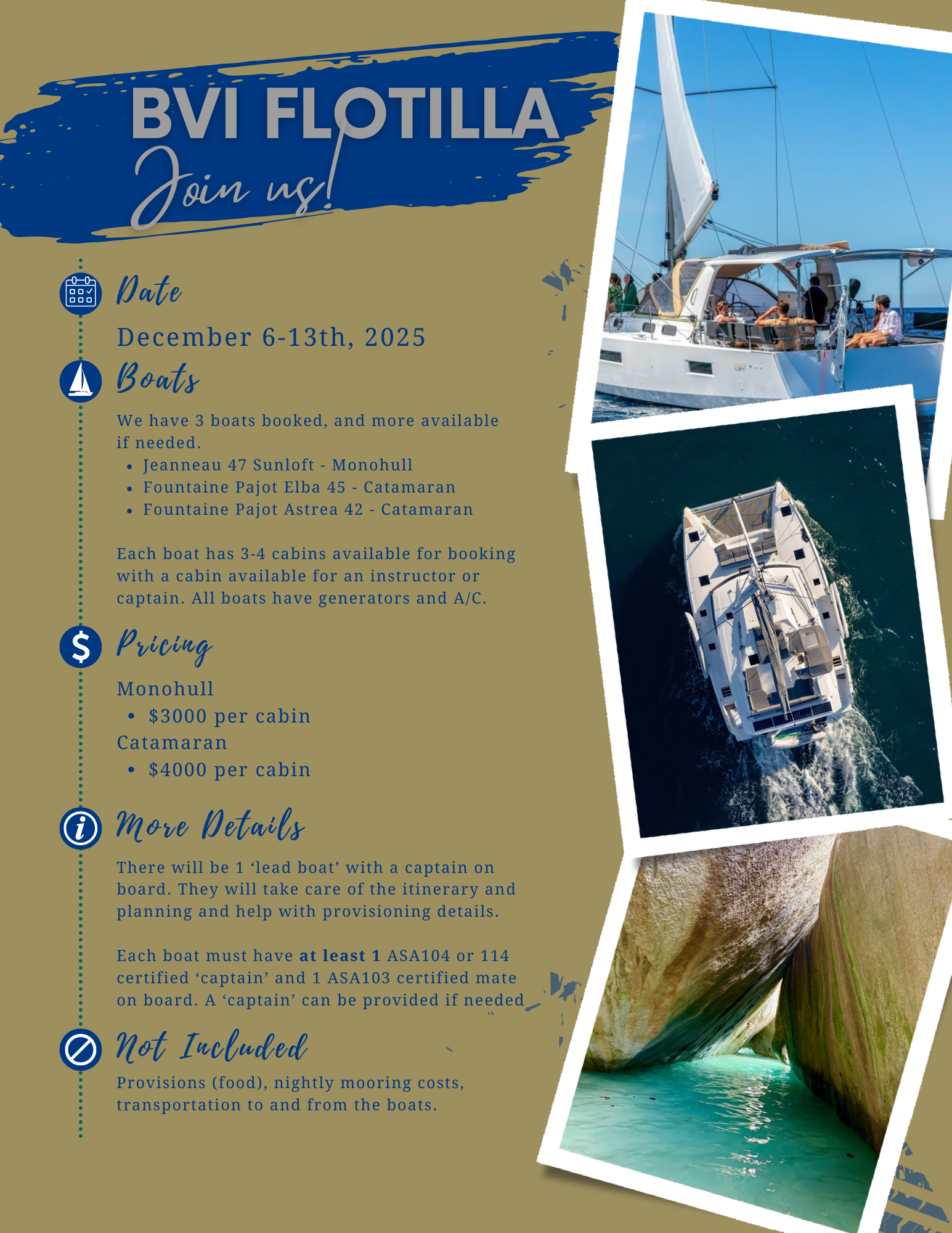 You are responsible for your airfare, transportation to and from the marina, provisioning ($500 will be included for the boat provisioning), and any incidentals.